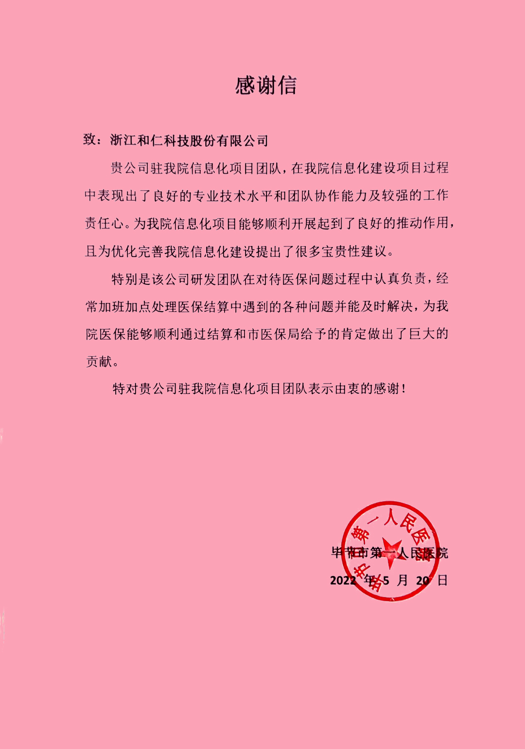 在這春意盎然、感恩勞動的五月,浙江和仁科技股份有限公司(以下簡稱“和仁科技”)收到了一封來自畢節市第一人民醫院的感謝信,字里行間充滿了對駐場團隊良好專業技術和團隊協作能力的認可與贊揚,特別表揚了和仁科技團隊加班加點,助力醫院醫保順利通過結算。